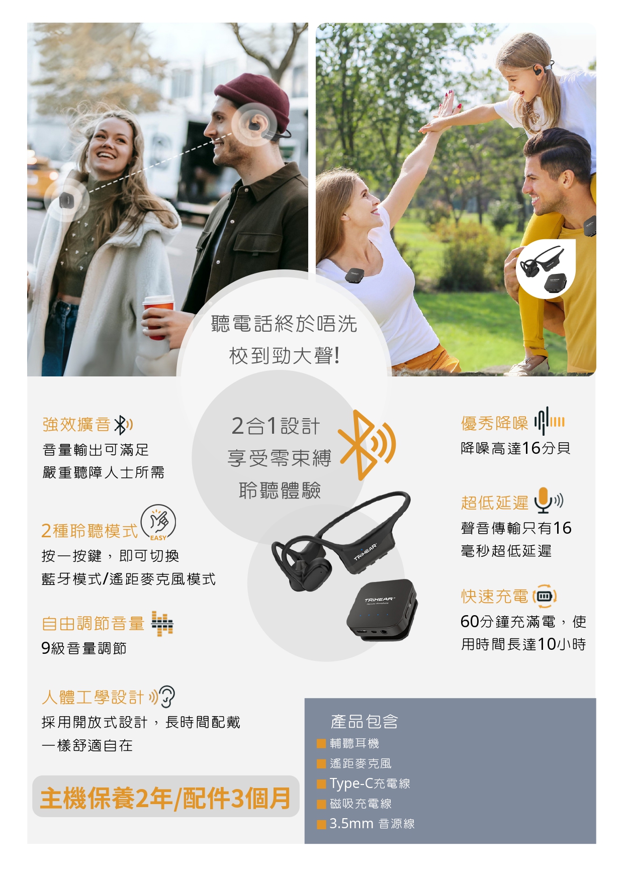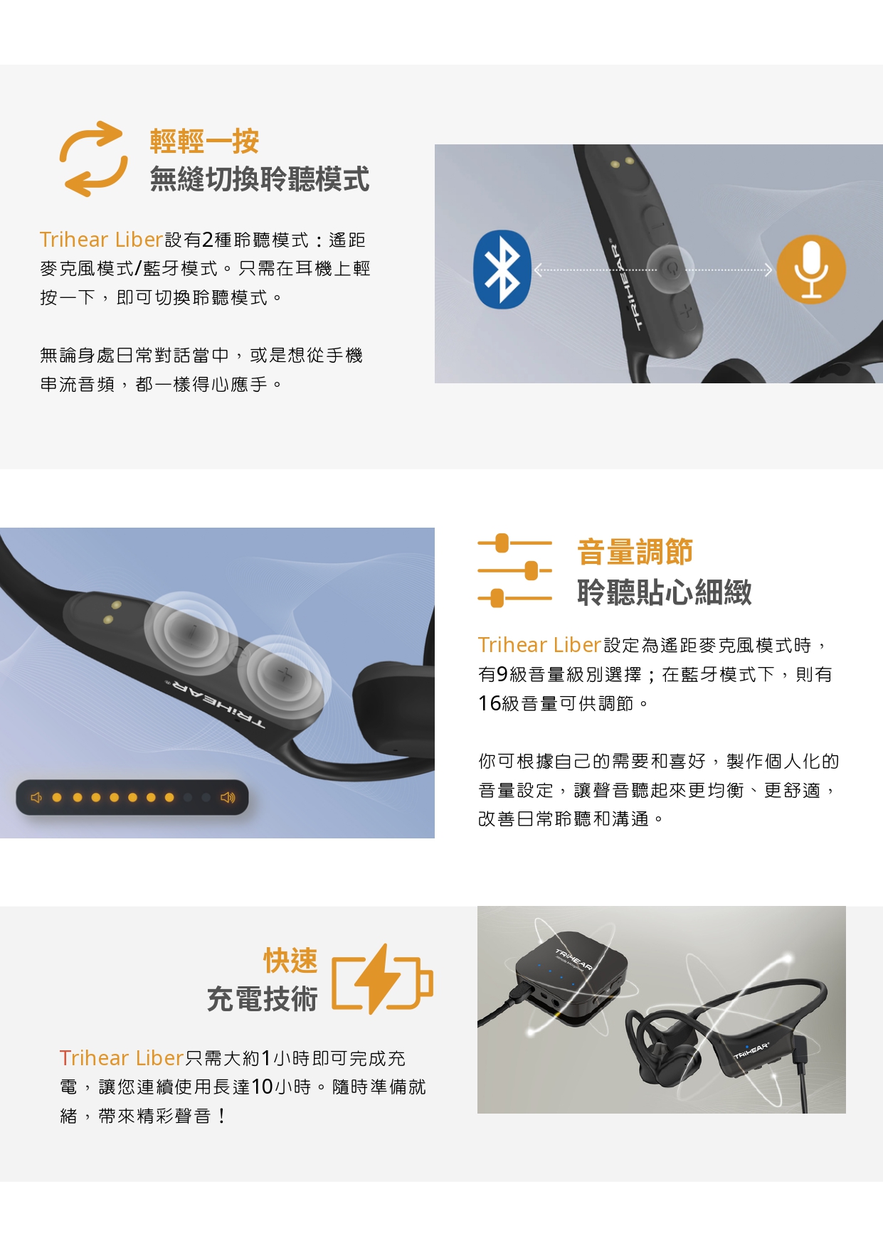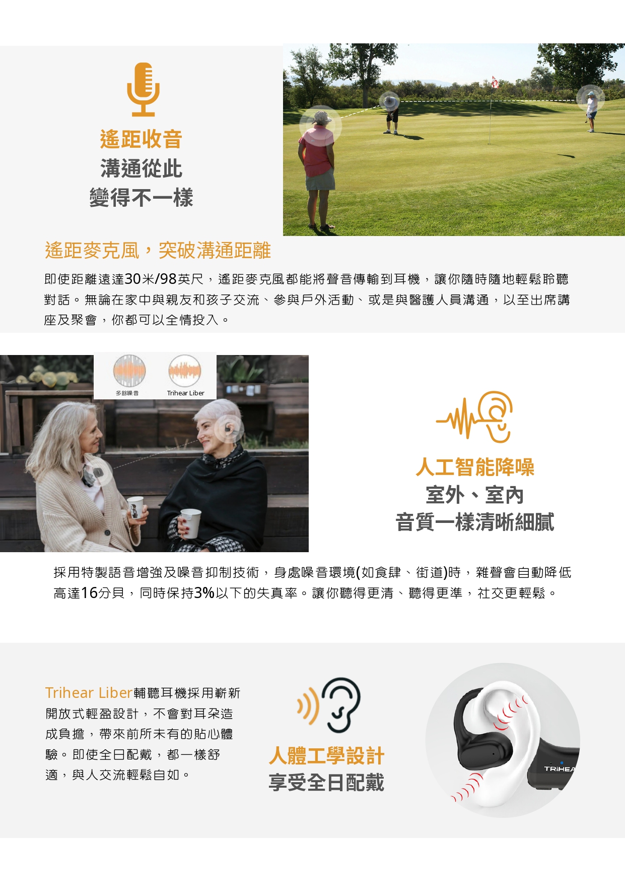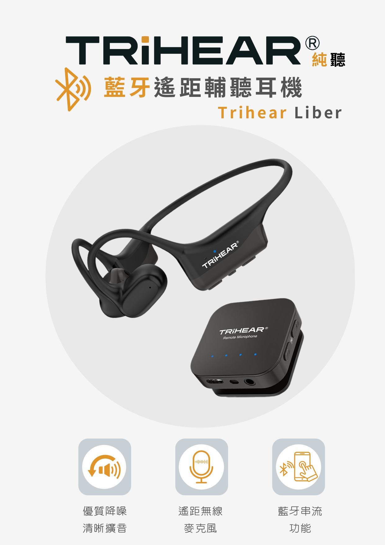 - Trihear Liber 輔聽耳機操作簡單,適合長者使用,耳機設計符合人體工學,除了遠距離擴音功能,更可以通過藍牙無線連接手機,獨有噪音抑制技術,降低環境雜聲16分貝